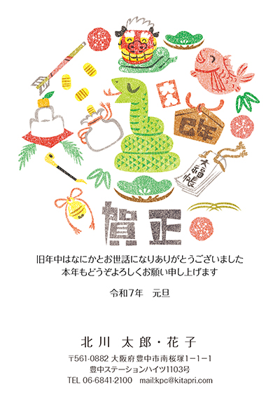 ご家族、友人への年賀状におすすめ。2025年巳年が明るい年になるように七福神や招き猫を描いたデザインを10種類用意しました。